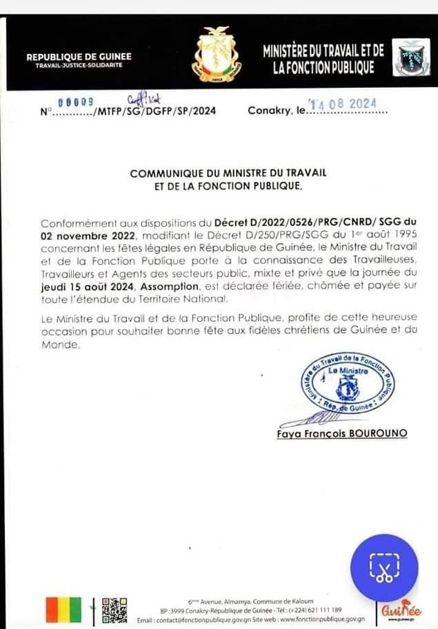 Conformément aux dispositions du décret du 02 novembre 2022, le Ministre du Travail et de la Fonction Publique, Faya François Bourouno, annonce que la journée du jeudi 15 août 2024, marquant l’Assomption, est déclarée fériée, chômée et payée sur l’ensemble du territoire national. À cette occasion, le ministre adresse ses vœux de bonne fête aux fidèles chrétiens de Guinée et du monde.