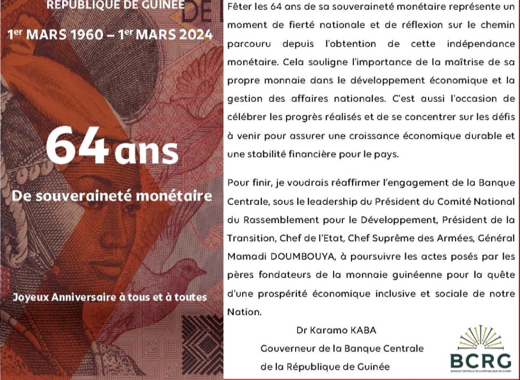 La monnaie guinéenne a 64 ans jour pour jour ce vendredi 1er mars 2024. À cette occasion, le gouverneur de la banque centrale de la République de Guinée a fait passer un message pour exprimer de nouveau la fierté des Guinéens d’assurer pleinement cette souveraineté monétaire.