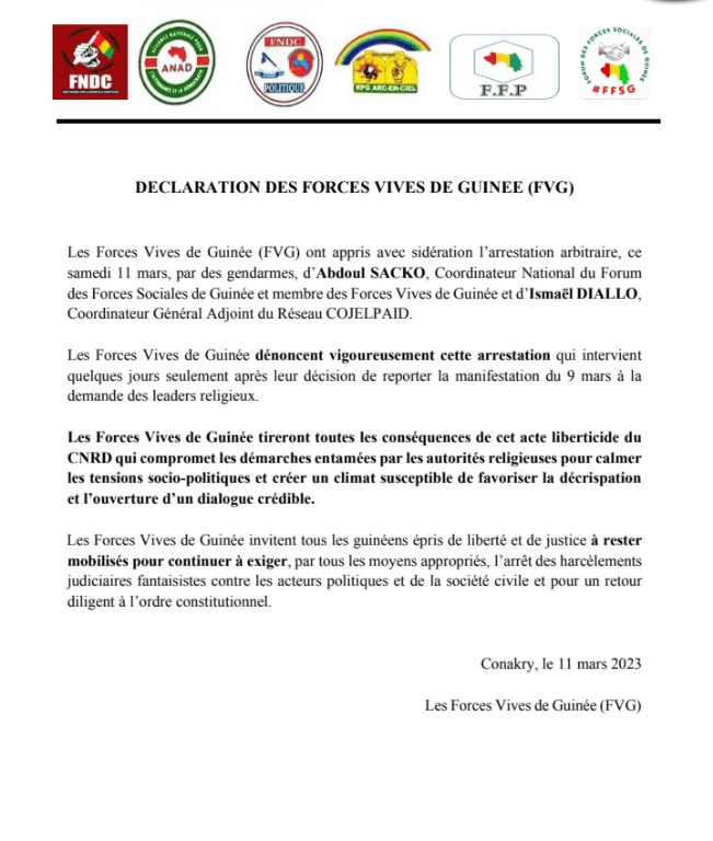 Au tour des forces vives de Guinée de réagir sur l’arrestation de deux acteurs de la société civile (Abdoul Sacko du FFSG et Ismaël Diallo du réseau COJEPAID. Dans une déclaration publiée ce samedi 11 mars 2023, les FVG condamnent cet acte et indiquent qu’ils tireront toutes les conséquences de ces arrestations.
