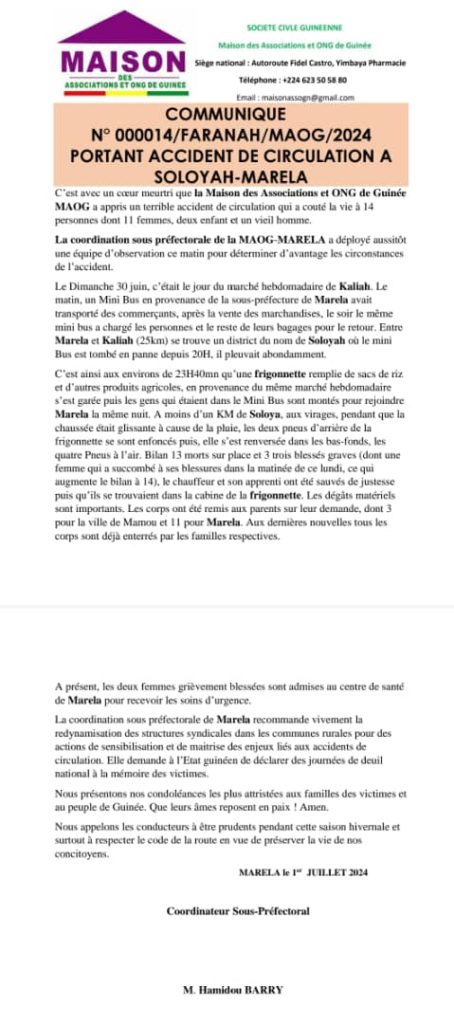 La Maison des Associations et ONG de Guinée (MAOG) exprime sa profonde tristesse suite à un grave accident de circulation qui a coûté la vie à 14 personnes, dont 11 femmes, deux enfants et un vieil homme, entre les districts de Marela et Kaliah. La coordination sous-préfectorale de la MAOG-MARELA enquête pour déterminer les circonstances de cette tragédie survenue après le marché hebdomadaire de Kaliah. Ci-dessous le communiqué de la MAOG: