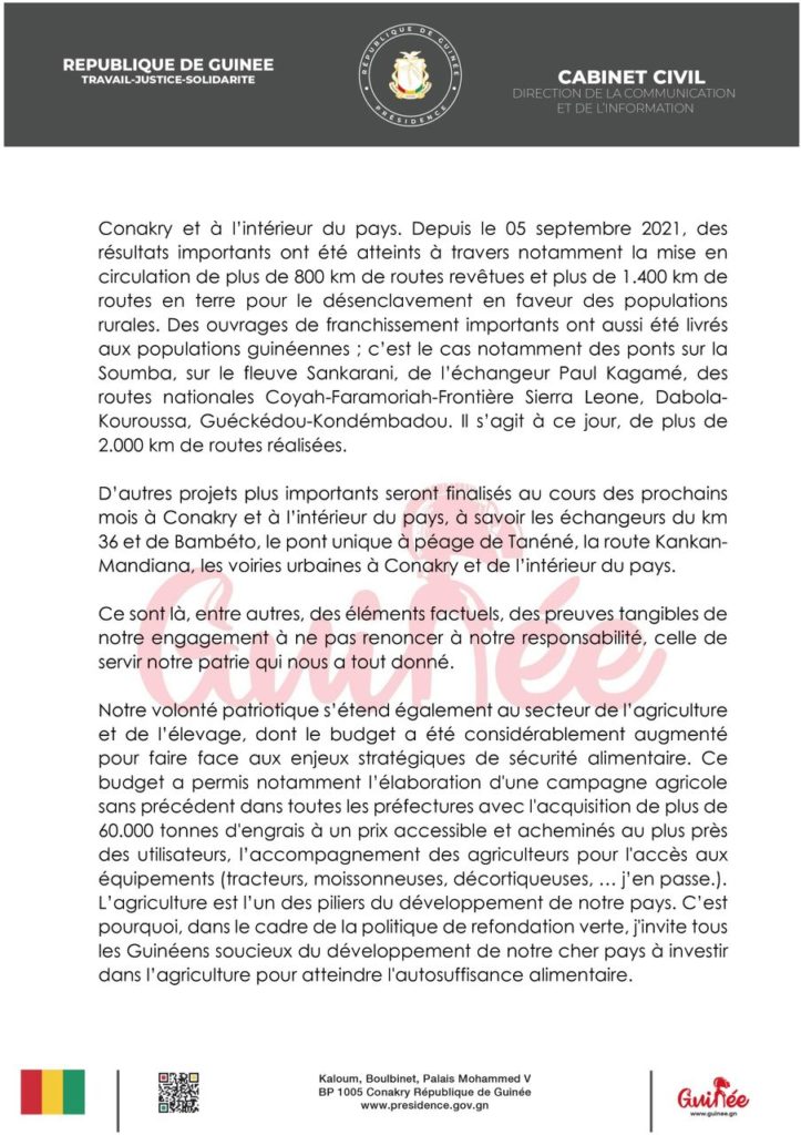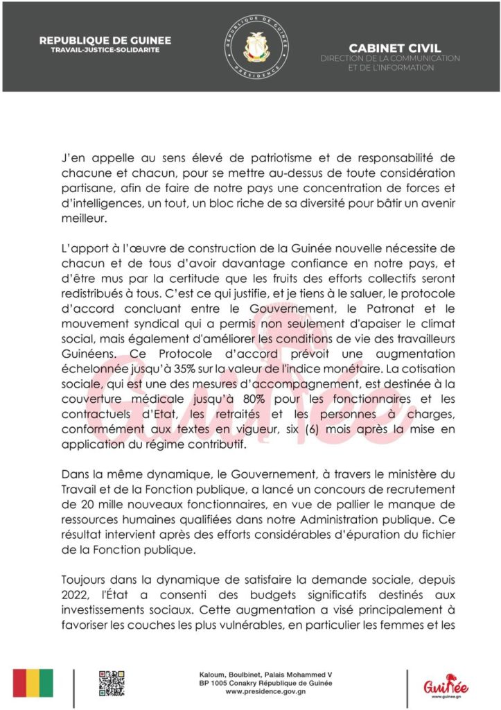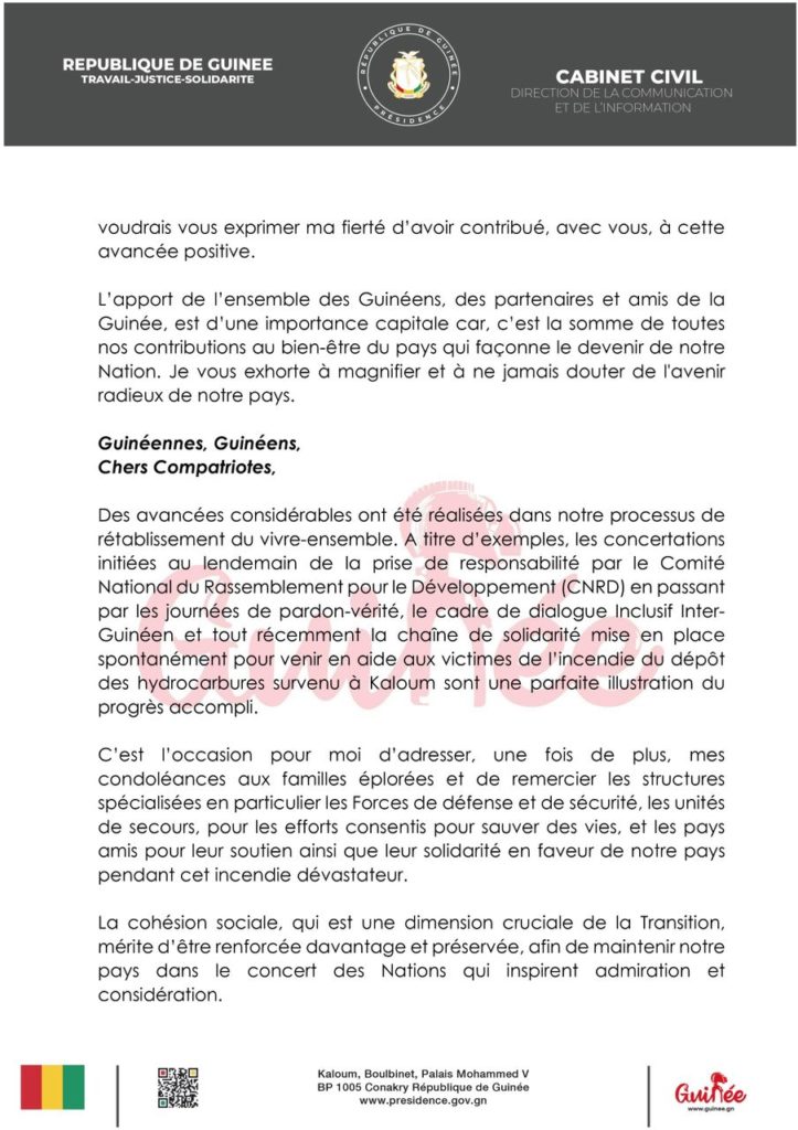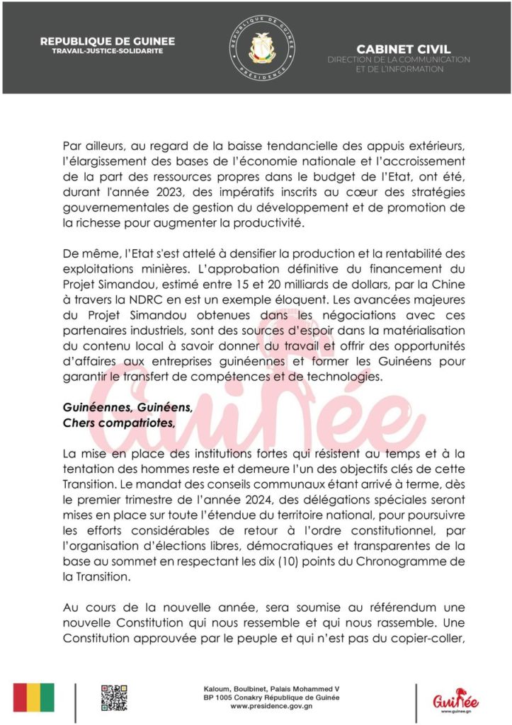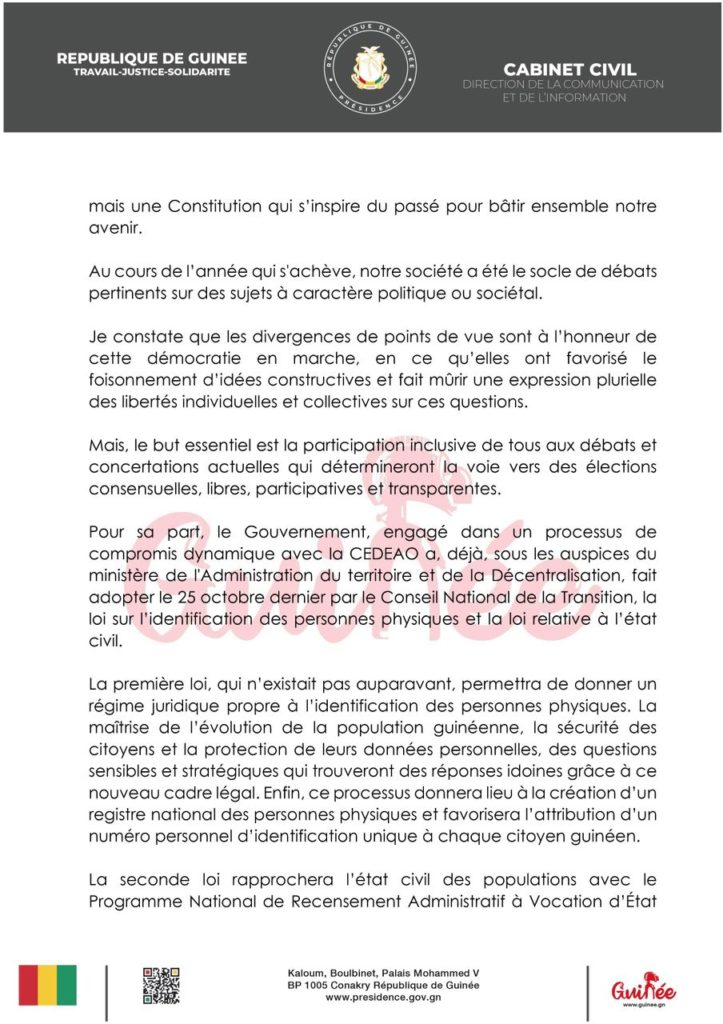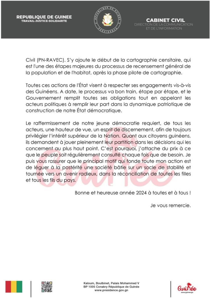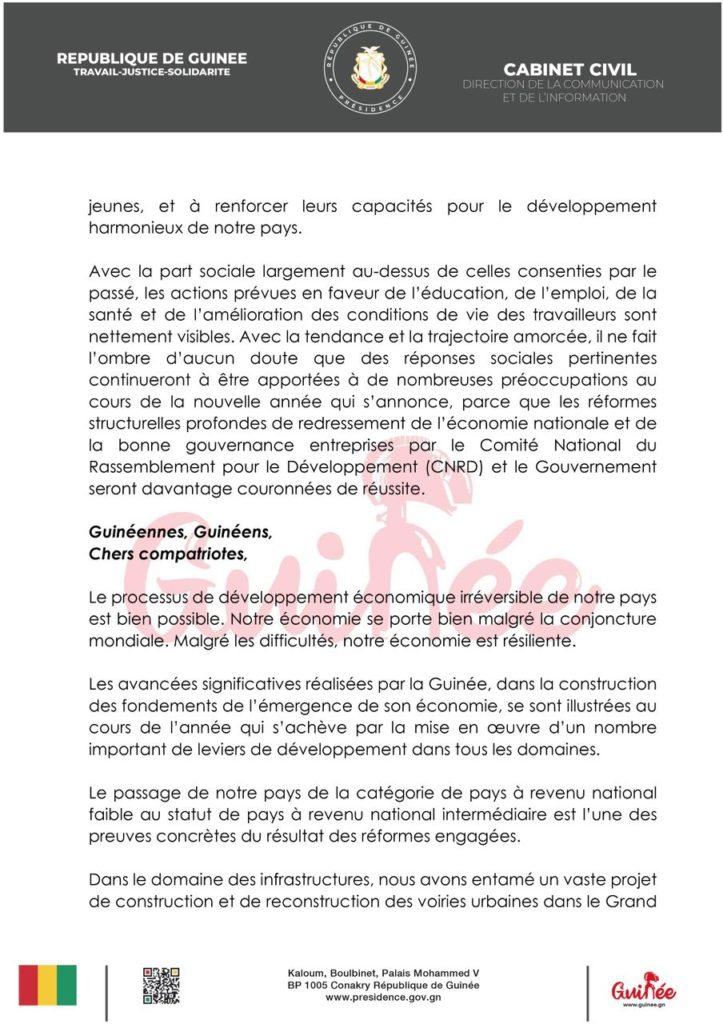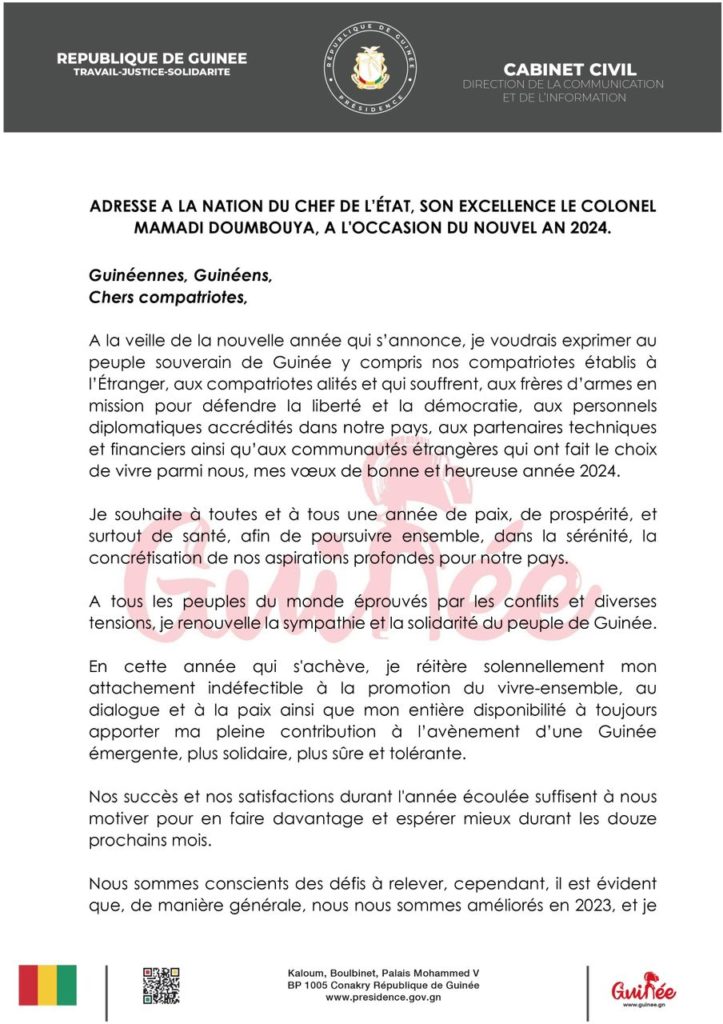 ActualitéPOLITIQUE Adresse à la nation: Mamadi Doumbouya annonce plusieurs réformes pour l’année 2024 (discours) par Pathé DIALLO Last updated Jan 1, 2024 0 Share Partager : Partager sur Facebook(ouvre dans une nouvelle fenêtre) Facebook Partager sur X(ouvre dans une nouvelle fenêtre) X CNRDcolonel Mamadi DoumbouyaGuinéeNouvel An 0 Share FacebookTwitterWhatsAppCourriel