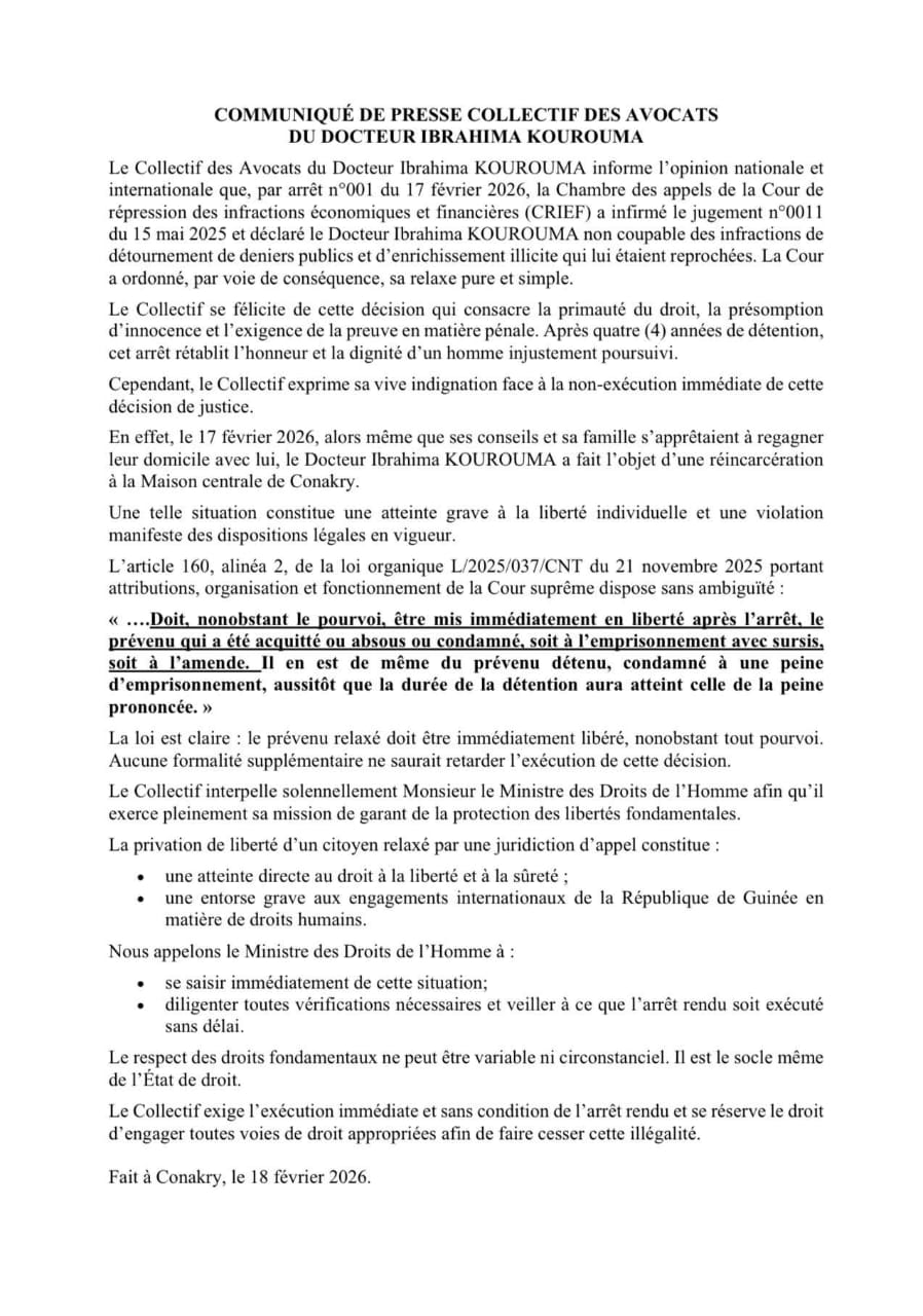 Relaxé par la Chambre des appels de la CRIEF après plusieurs années de détention, le Dr Ibrahima Kourouma n’a pourtant pas recouvré la liberté. Dans un communiqué, son collectif d’avocats dénonce une non-exécution de l’arrêt et parle d’atteinte grave aux libertés fondamentales, appelant les autorités compétentes à faire appliquer sans délai la décision de justice.