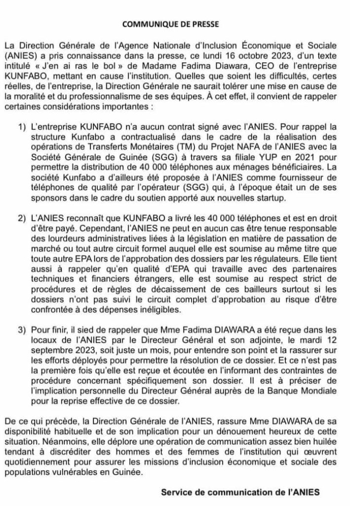Après avoir opté pour le silence dans l’affaire de téléphone avec l’entreprise Kunfabo, l’Agence Nationale d’Inclusion Economique et Sociale (ANIES) sort enfin de son coma profond.
