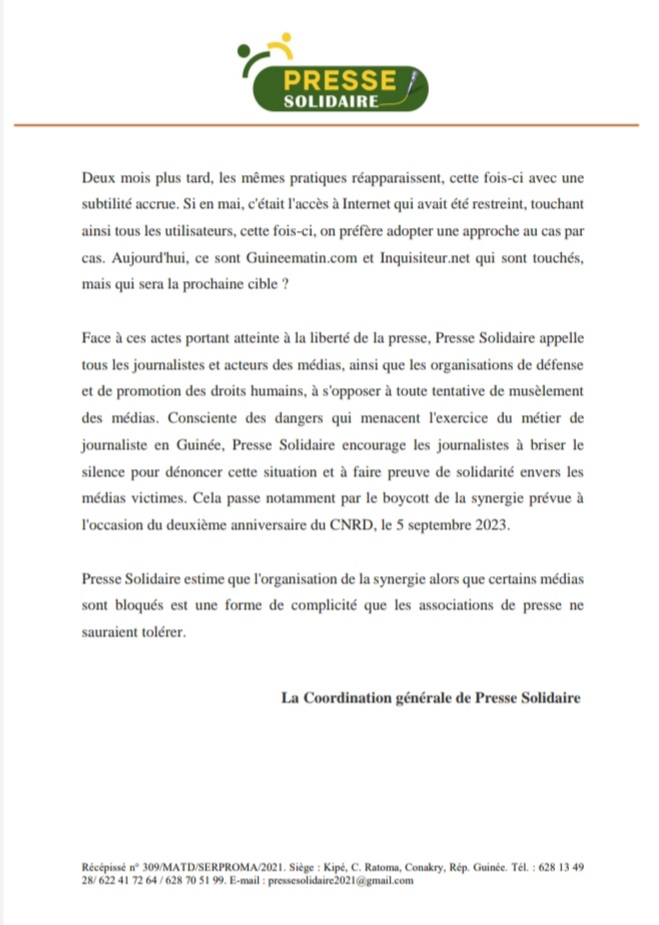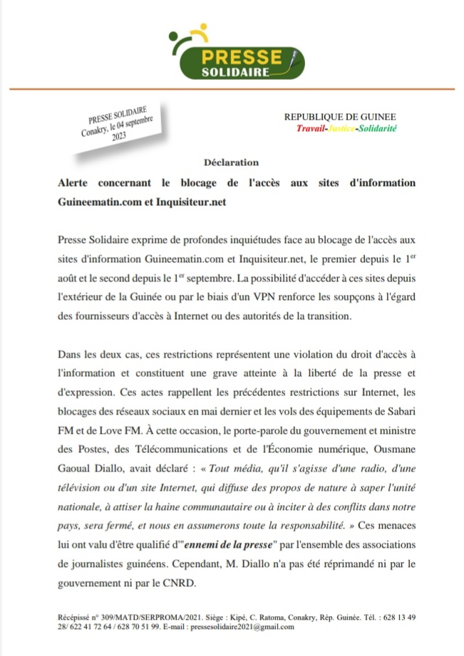 L’organisation de cette synergie intervient alors que les sites d’informations guineematin.com et inquisiteur.net sont bloqués.