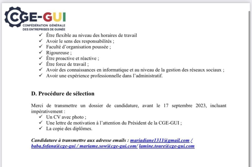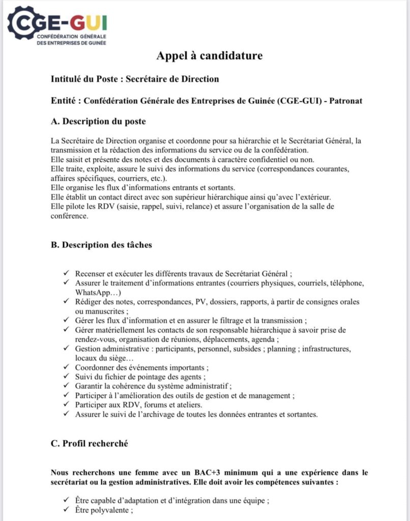 La confédération générale des entreprises de Guinée (CGE-GUI) recherche une secrétaire de direction. L’intéressée doit avoir un BAC et avoir une expérience dans le secrétariat ou la gestion administrative.