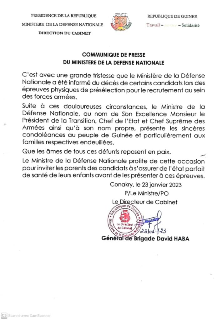 Dans un communiqué publié ce lundi 23 janvier 2023, le ministère de la défense nationale présente ses condoléances suite au décès de certains candidats lors des épreuves physiques de présélection pour le recrutement au sein des forces armées.