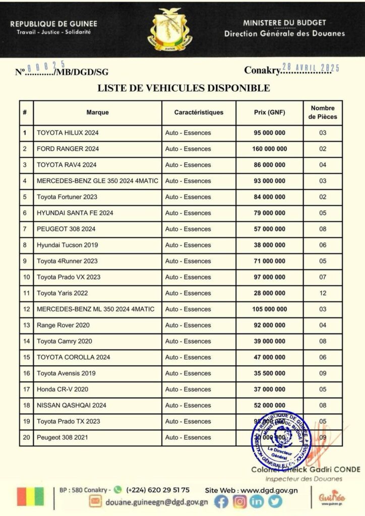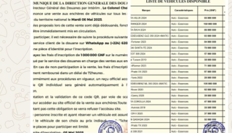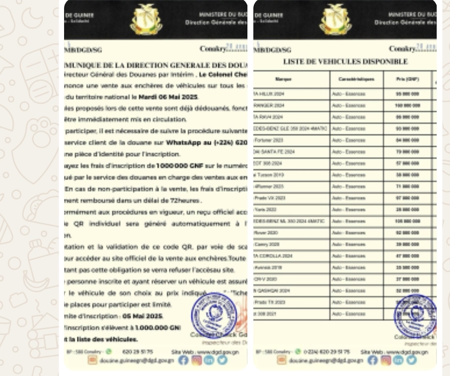 Le stratagème est bien rôdé : pour appâter leurs victimes, les escrocs les invitent à contacter un supposé service client de la douane via WhatsApp, au numéro 620 29 51 75. Une fois le contact établi, ils exigent le versement de 1 million de francs guinéens au titre des « frais d’inscription ». En pièce jointe, une liste alléchante de véhicules — marques, années et prix — est envoyée, pour rendre l’offre encore plus crédible.