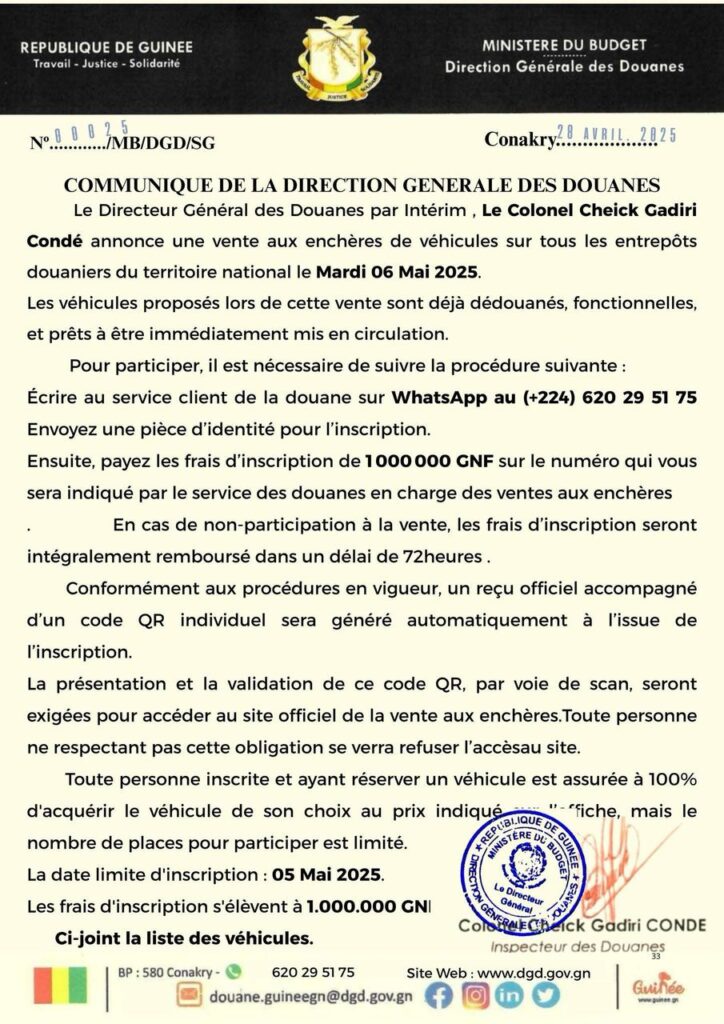 Personnellement touché par cette tentative, j’ai reçu le communiqué par le biais de ma femme, consciente de ma recherche actuelle d’un véhicule pour les besoins de ma nouvelle fonction. Pris dans l’élan, j’étais à deux doigts de m’inscrire. Toutefois, par prudence, j’ai transmis ledit communiqué à Monsieur Cheick Gadiri Condé, Directeur Général intérimaire des Douanes et camarade de promotion, pour vérification.
