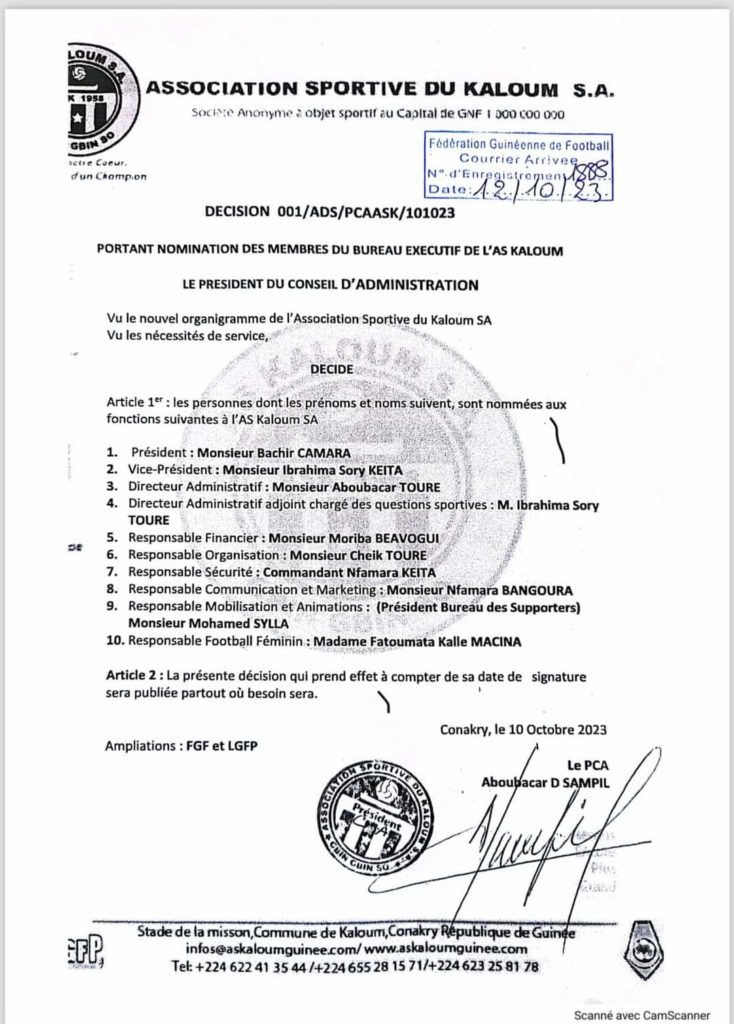 Bouba Sampil devient selon cette décision le président du conseil d’administration de l’AS Kaloum.