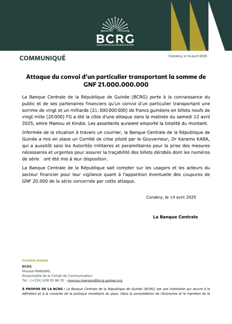 Un convoi privé transportant vingt et un milliards de francs guinéens en billets neufs de 20 000 FG a été attaqué le samedi 12 avril 2025, entre Mamou et Kindia. La Banque Centrale de la République de Guinée, informée de l’incident, a immédiatement mis en place un comité de crise et sollicité l’appui des forces de sécurité pour retrouver les coupures volées, désormais traçables grâce à leurs numéros de série.