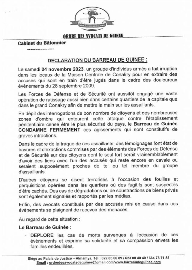 Le Barreau de Guinée s’est fait entendre sur les évènements survenus le week-end dernier à la maison centrale de Conakry. Dans un communiqué publié ce mercredi, le Barreau “condamne fermement” les cas de morts enregistrés lors de cette attaque.