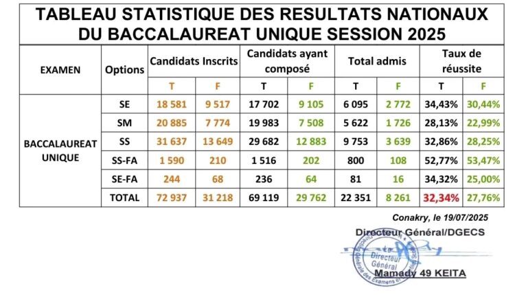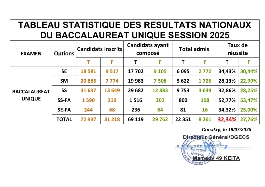 Le ministère de l’Éducation nationale et de l’Alphabétisation a rendu publics ce samedi les résultats officiels du Baccalauréat unique, session 2025. Ces chiffres viennent clore une étape cruciale du parcours scolaire pour des milliers de jeunes Guinéens.