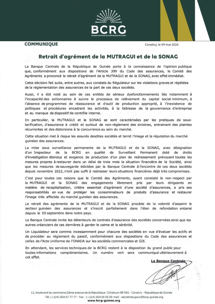 Le Comité des Agréments, par Décisions N°D/2024/005/CAM et N°D/2024/006/CAM du 05 avril 2024, a respectivement retiré les agréments de la Société d’Assurances et de Réassurance des Travailleurs de Guinée MUTRAGUI et de la Société Nouvelle d’Assurances de Guinée Guinée.