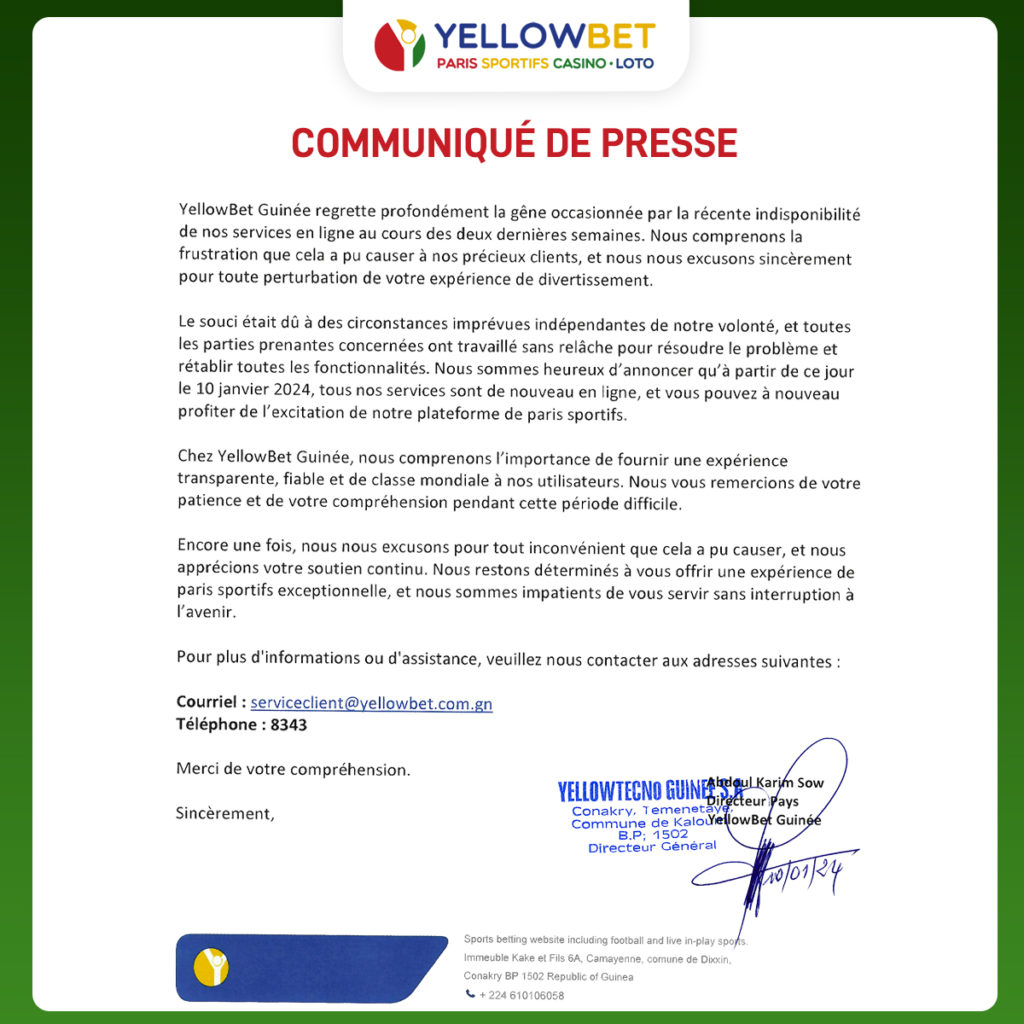 YellowBet Guinée regrette profondément la gêne occasionnée par la récente indisponibilité de nos services en ligne au cours des deux dernières semaines. Nous comprenons la frustration que cela a pu causer à nos précieux clients, et nous nous excusons sincèrement pour toute perturbation de votre expérience de divertissement.