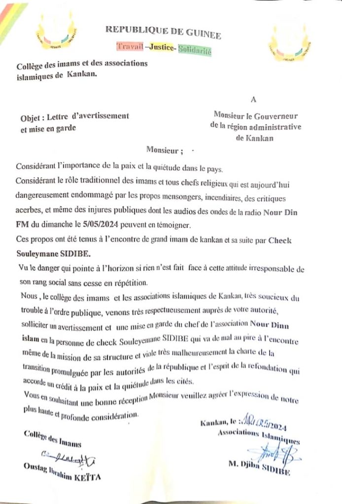 Selon ces religieux, le président de cette association islamique aurait tenu des propos d’injures publiques à travers son média <<Nourdine média>> à l’encontre du grand imam de Kankan et cie le dimanche 5 mai 2024. Ci-dessous la lettre conjointe .