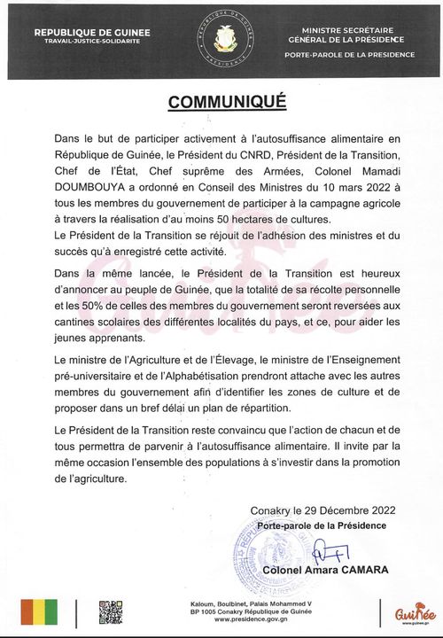 Le colonel Mamadi Doumbouya a également annoncé que la totalité de sa récolte personnelle et les 50% de celles des membres du gouvernement seront reversées aux cantines scolaires. Cette initiative vise à aider les jeunes apprenants des différentes localités du pays.