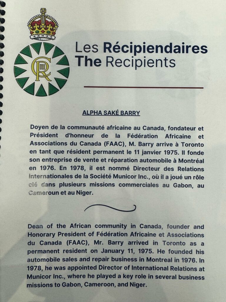 Cette reconnaissance souligne l’engagement exceptionnel de M. Barry envers la communauté africaine et son dévouement à promouvoir nos valeurs et notre culture au sein de la société canadienne. Nous sommes honorés de compter parmi nous un leader dont les efforts sont reconnus à l’échelle nationale.