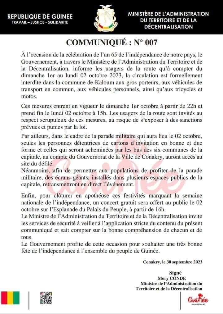 Dans un communiqué publié par le ministère de l’administration du territoire et de la décentralisation, le gouvernement guinéen informe les usagers de la route qu’à compter de ce dimanche 1er octobre au lundi 02 octobre 2023, la circulation est formellement interdite dans la commune de Kaloum aux gros porteurs, aux véhicules de transport en commun, aux véhicules personnels, ainsi qu’aux tricycles et motos.