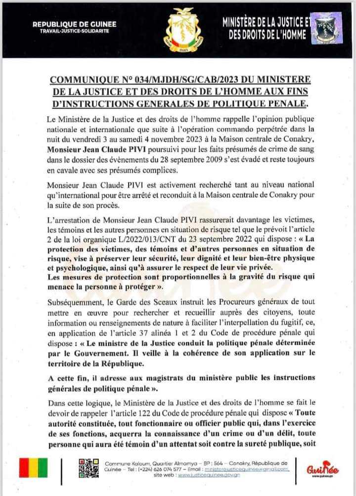 Face à ses difficultés de retrouver Claude Pivi l’un des quatre évadés lors de l’attaque contre la maison centrale de Conakry le week-end dernier, le Ministère de la justice sollicite l’aide des citoyens de la capitale pour le localiser.