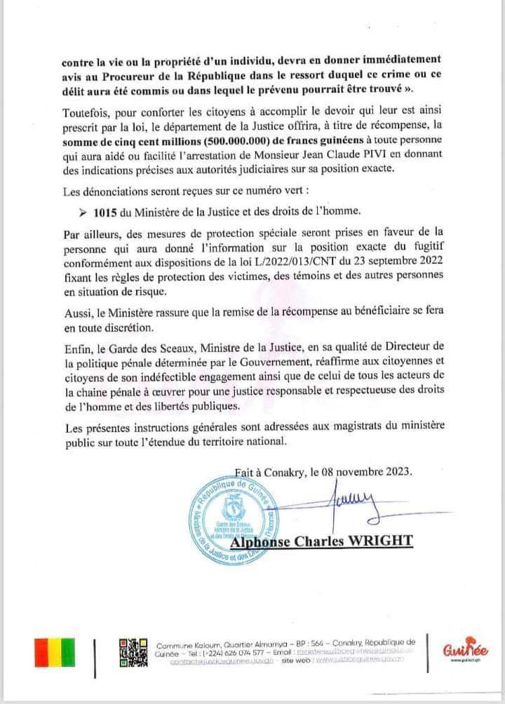 Dans un communiqué publié ce mercredi 8 novembre, le département a promis d’offrir une somme de 500 millions de francs guinéens à chaque personne qui aura aidé à arrêter Pivi.
