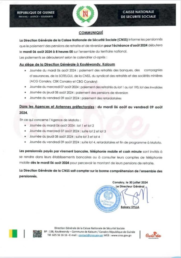 La Direction Générale de la Caisse Nationale de Sécurité Sociale (CNSS) informe les pensionnés que le paiement des pensions de retraite et de réversion pour l’échéance d’août 2024 commencera le mardi 06 août 2024 à 8 heures 00 sur l’ensemble du territoire national. Ci-dessous le communiqué :