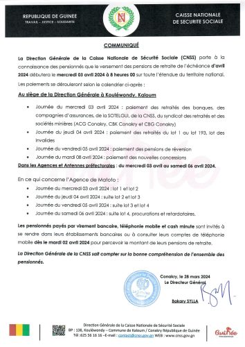 La Direction Générale de la Caisse Nationale de Sécurité Sociale (CNSS) porte à la connaissance des pensionnés que le versement des pensions de retraite de l’échéance d’avril 2024 débutera le mercredi 03 avril 2024 à 8 heures 00 sur toute l’étendue du territoire national.