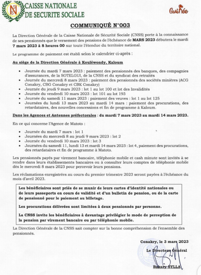 La direction générale de la caisse nationale de sécurité sociale (CNSS) porte à la connaissance de ses pensionnés que le versement des pensions de l’échéance Mars 2023 démarrera le mardi 7 mars 2023 à partir de 8h 00 sur toute l’étendue du territoire national.