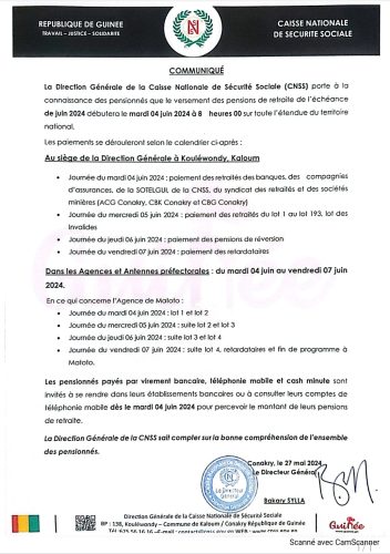 La Direction Générale de la Caisse Nationale de Sécurité Sociale (CNSS) porte à la connaissance des pensionnés que le versement des pensions de retraite de l’échéance de juin 2024 débutera le mardi 04 juin à 8 heures 00 sur toute l’étendue du territoire national. Pour tous les détails lire le communiqué ci-dessous :