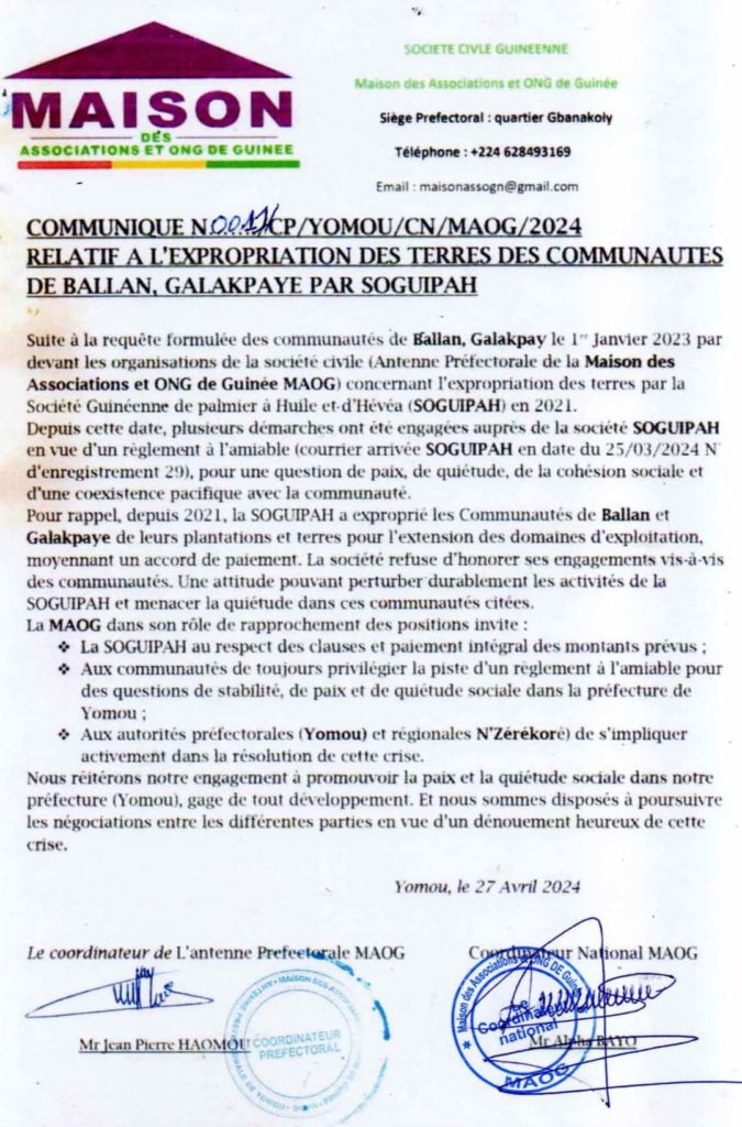 Suite à la requête formulée des communautés de Ballan, Galakpay le 1er Janvier 2023 par devant les organisations de la société civile (Antenne Préfectorale de la Maison des Associations et ONG de Guinée MAOG) concernant l’expropriation des terres par la Société Guinéenne de palmier à Huile et d’Hévéa (SOGUIPAH) en 2021, plusieurs démarches ont été engagées auprès de la société SOGUIPAH en vue d’un règlement à l’amiable (courrier arrivée SOGUIPAH en date du 25/03/2024 N d’enregistrement 29), pour une question de paix, de quiétude, de cohésion sociale et d’une coexistence pacifique avec la communauté.