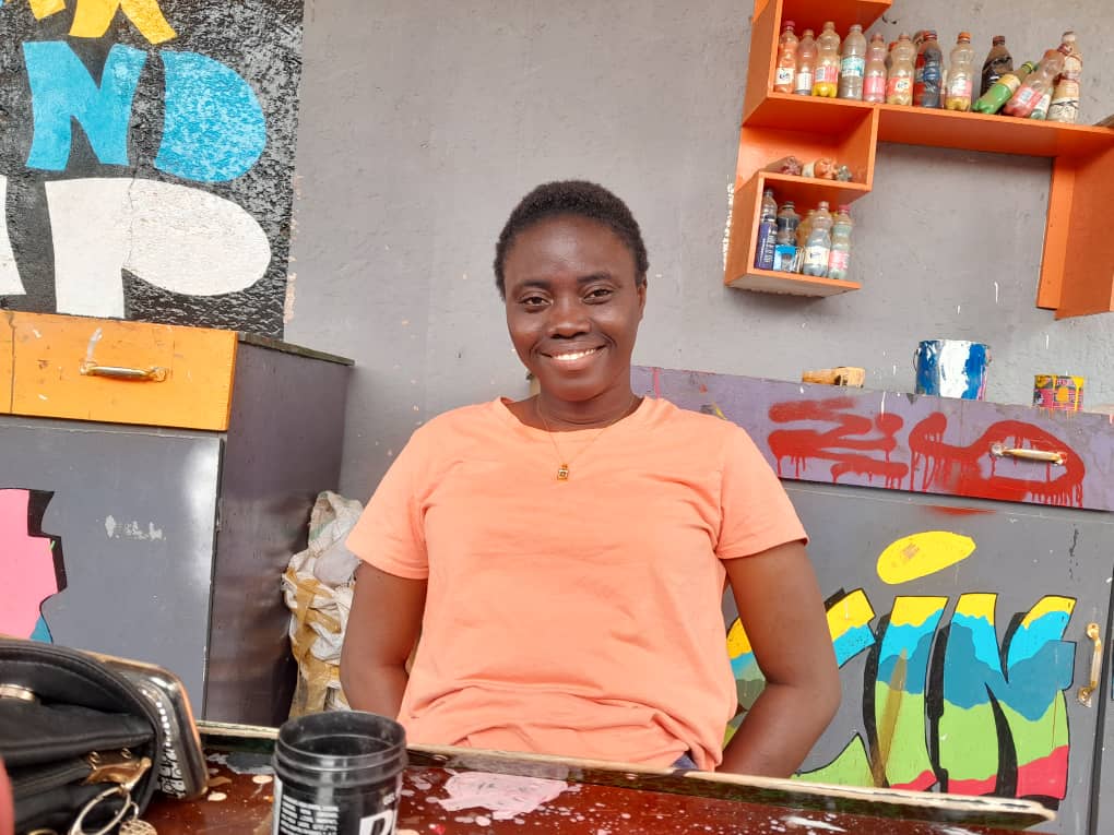 Aujourd’hui, ils sont quatre à avoir effectué le déplacement pour peindre certains tableaux. Djeinab Savane, diplômée en Linguistique Communication est une apprenante au sein de Guinée Challenge. Pourtant, elle n’est pas passée par une école d’art :