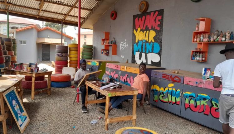 Dans un quartier de Nongo où les restaurants et écoles occupent les bordures des routes, Guinée Challenge a trouvé son espace juste à côté de l’université UNC. Introduit dans la cour les locaux du label attirent rapidement les yeux par son apparence. Entourés par des pneus peints avec les couleurs du drapeau guinéen « rouge, jaune et vert », les peintres apprenants échangent autour de leur dernière exposition.