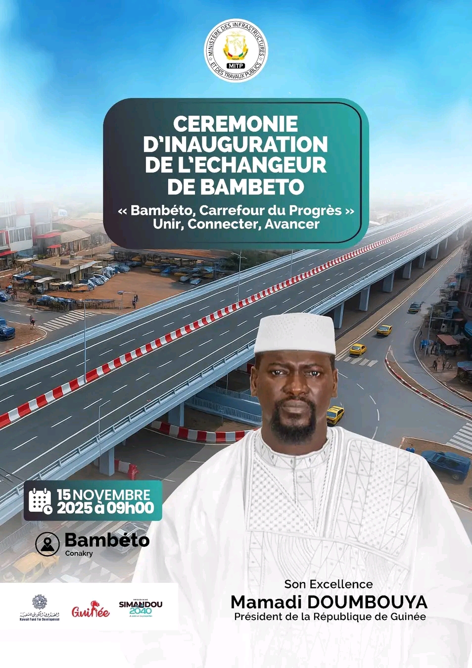 Le ministère des Infrastructures et des Travaux publics a annoncé l’inauguration officielle de l’échangeur de Bambéto, prévue pour le samedi 15 novembre 2025, sous la présidence du Chef de l’État, Mamadi Doumbouya.
