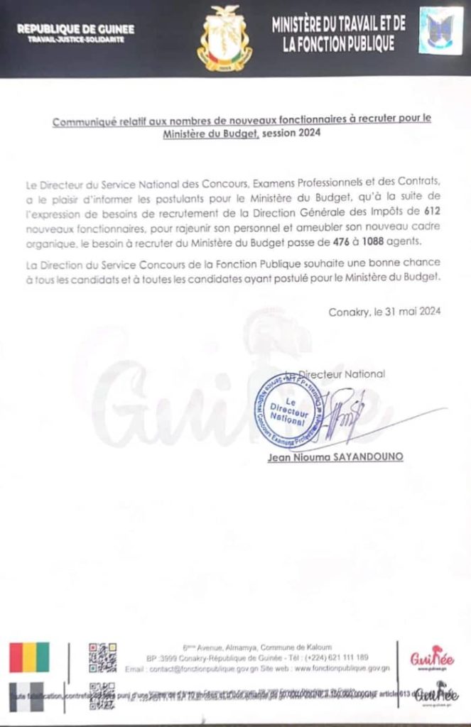 Le Directeur du Service National des Concours, Examens Professionnels et des Contrats, a le plaisir d’informer les postulants pour le Ministère du Budget, qu’à la suite de l’expression de besoins de recrutement de la Direction Générale des Impôts de 612 nouveaux fonctionnaires, pour rajeunir son personnel et à meubler son nouveau cadre organique, le besoin à recruter du Ministère du Budget passe de 476 à 1088 agents.