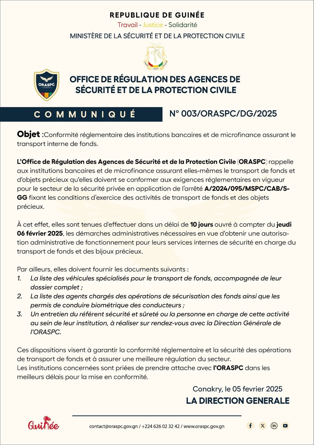 À travers un communiqué en date du 5 février 2025, l’Office de Régulation des Agences de Sécurité et de la Protection Civile (ORASPC) exige des institutions bancaires et de microfinance assurant elles-mêmes le transport de fonds de se conformer aux réglementations en vigueur. Elles disposent de dix jours ouvrés, à compter du 6 février, pour obtenir une autorisation administrative et fournir les documents requis.