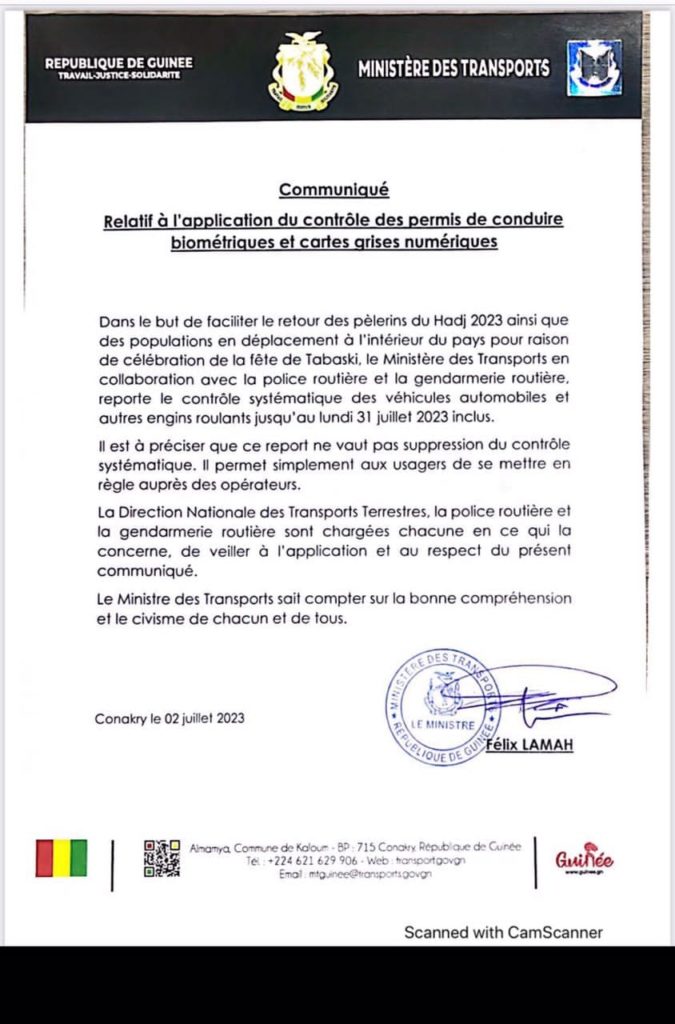 Dans un communiqué rendu public ce dimanche 2 juillet 2023, le ministère des transports a annoncé le report du contrôle systématique des permis de conduire et de cartes grises biométriques des automobiles.