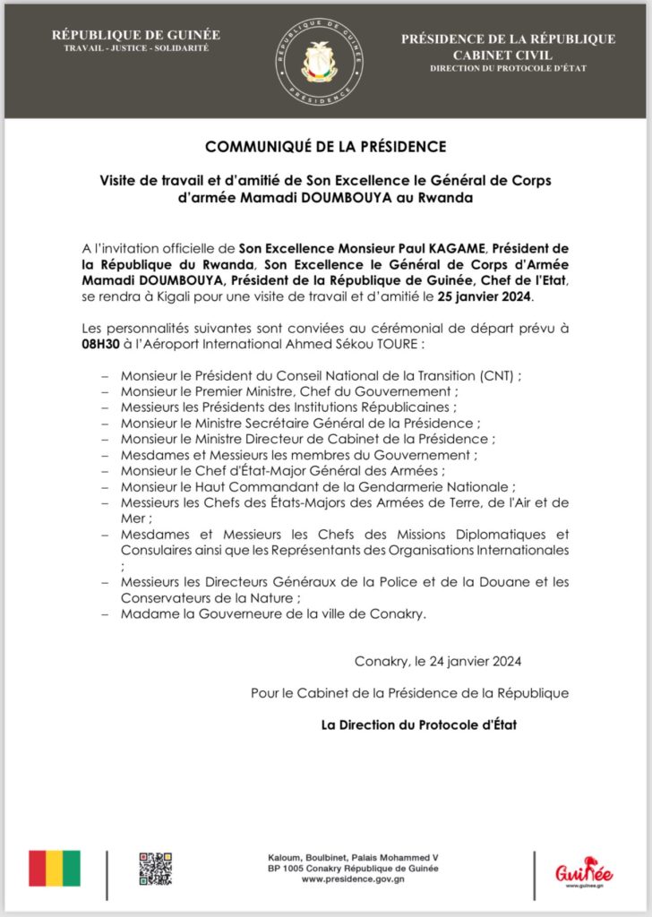 A l’invitation officielle de Son Excellence Monsieur Paul KAGAME, Président de la République du Rwanda, Son Excellence le Général de Corps d’Armée Mamadi DOUMBOUYA, Président de la République de Guinée, Chef de l’Etat, se rendra à Kigali pour une visite de travail et d’amitié le 25 janvier 2024.