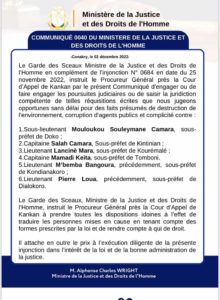 Dans un communiqué publié, Alphonse Charles Wright annonce avoir instruit au Procureur général près la cour d’appel de Kankan, d’engager des poursuites judiciaires contre le sous-lieutenant Mouloukou Souleymane Camara et Compagnie après leur révocation par le ministre de l’Administration du territoire et de la décentralisation.