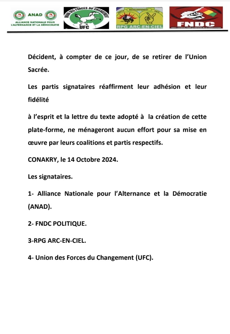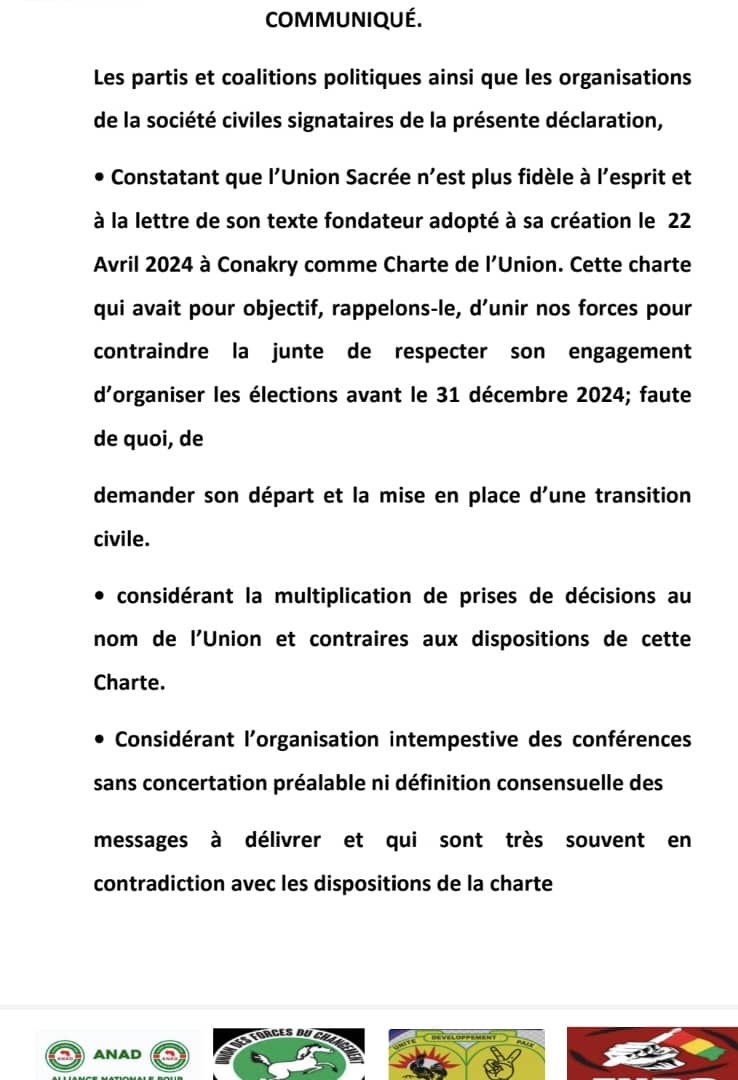 Dans un communiqué publié ce 14 octobre 2024 à Conakry, plusieurs partis politiques et organisations de la société civile, signataires de la Charte de l’Union Sacrée, ont annoncé leur retrait de cette alliance. Ils dénoncent une série de décisions contraires à l’esprit fondateur du regroupement, notamment le non-respect des engagements initiaux visant à contraindre la junte militaire à organiser des élections avant la fin de l’année.