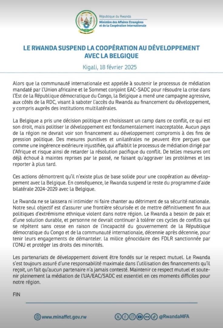 Le Rwanda a annoncé, ce mardi 18 février 2025, la suspension de son programme d’aide bilatérale 2024-2029 avec la Belgique. Kigali accuse Bruxelles d’avoir mené, aux côtés de la RDC, une campagne visant à entraver son accès au financement du développement. Cette décision intervient dans un contexte de tensions croissantes autour du conflit dans l’Est de la RDC et des efforts de médiation portés par l’Union africaine et les organisations régionales.