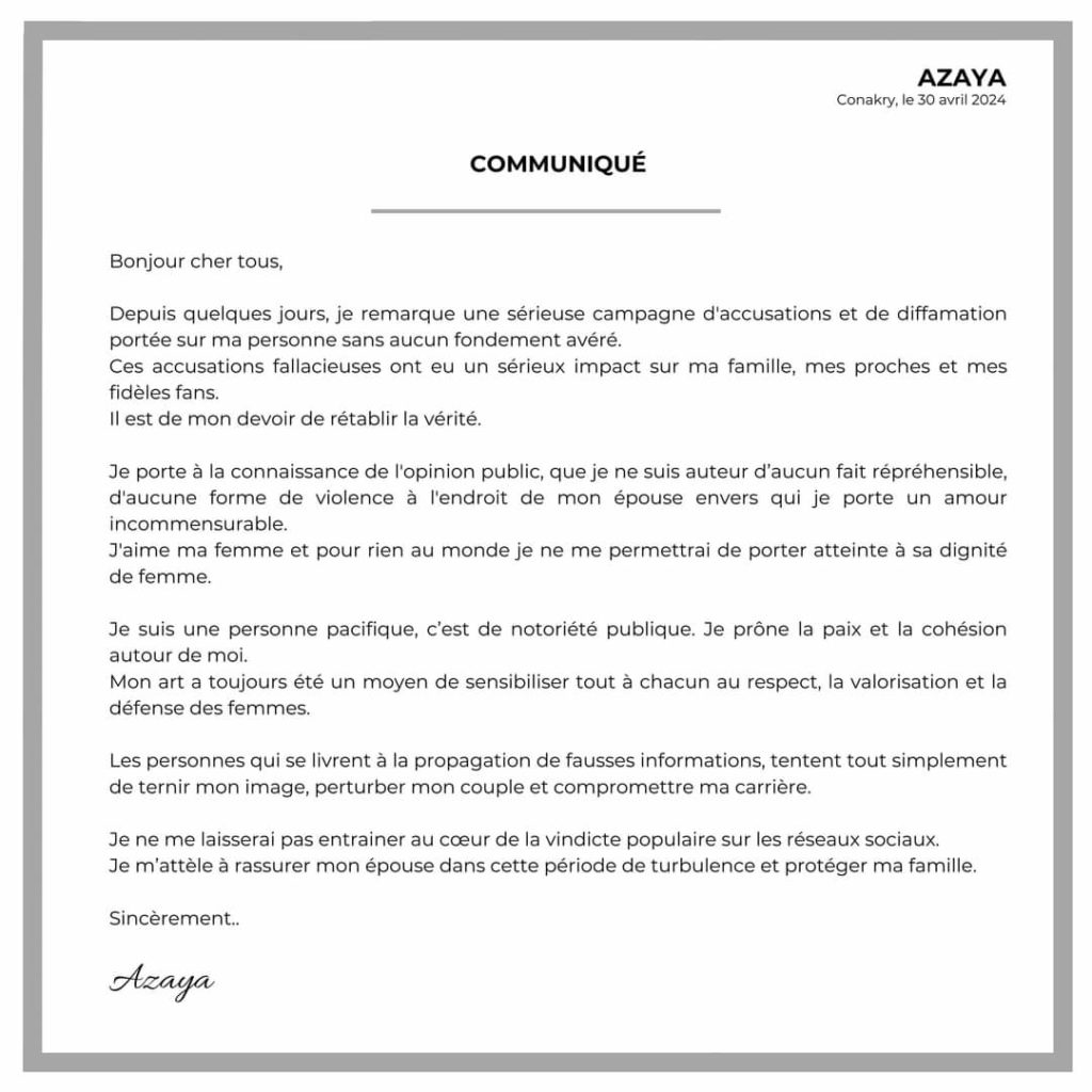 Dans un message posté sur ses canaux de communication, Mohamed Azaya Kamissoko a apporté des précisions sur les questions que beaucoup avaient commencé à croire concernant sa relation avec son épouse Djelikaba Bintou.