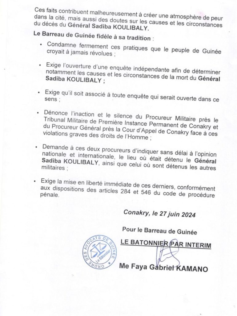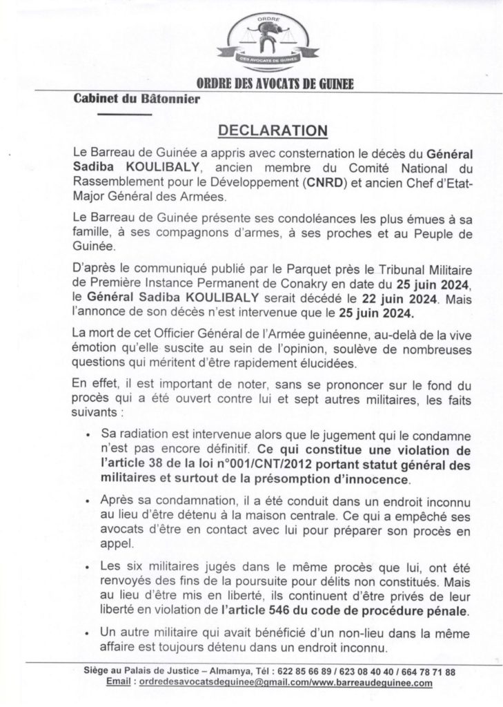 Le barreau de Guinée exige l’ouverture d’une enquête indépendante afin de déterminer les causes et les circonstances du décès du Général Sadiba KOULIBALY. Dans une déclaration publiée ce jeudi 27 juin 2024, l’ordre des avocats dénonce également l’inaction et le silence du procureur militaire près le tribunal militaire de première instance permanent de Conakry. Ci-dessous la déclaration du barreau de Guinée :