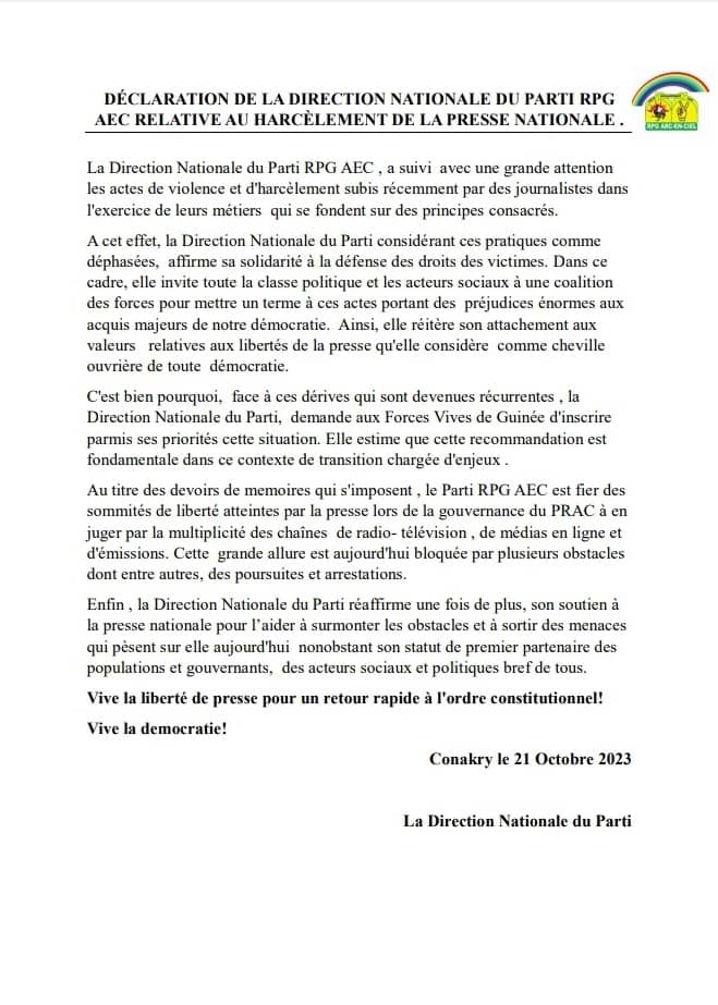 En outre dans un communiqué paru l’ancien parti au pouvoir fait une invite à l’endroit des acteurs politiques, sociaux mais aussi les Forces Vives de Guinée d’inscrire au premier rang la défense des journalistes.