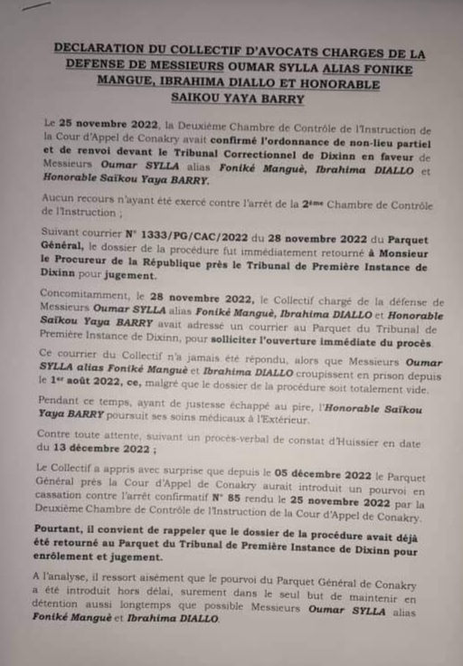Malgré les démarches engagées par les avocats de Oumar Sylla alias Foniké, Ibrahima Diallo et Saikou Yaya Barry, pour obtenir leur libération ou tout au moins pour la tenue de leur procès, ces acteurs restent toujours en prison.