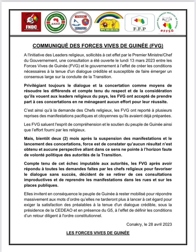 C’est une décision de dernière minute prise par les acteurs des forces de Guinée. Après près de deux mois des pourparlers avec le Premier ministre Dr Bernard Goumou, sous la médiation des chefs religieux du pays, les forces vives de Guinée décident de se retirer du processus.