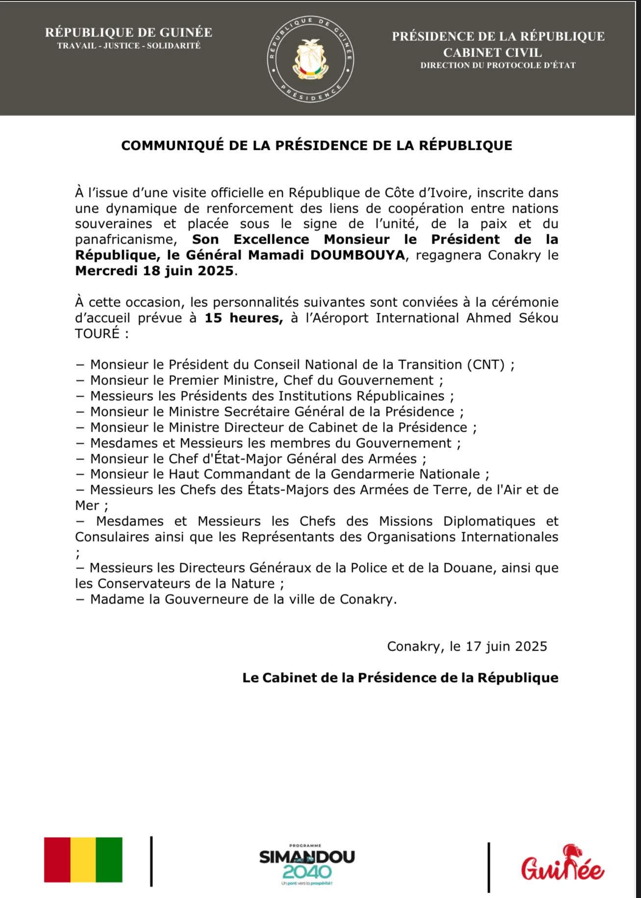 Au terme d’une visite officielle en République de Côte d’Ivoire, marquée par la volonté de renforcer les liens entre nations africaines souveraines, le Président de la République, Général Mamadi Doumbouya, regagnera Conakry ce mercredi 18 juin 2025. Une cérémonie d’accueil est prévue à 15 heures à l’Aéroport International Ahmed Sékou Touré, en présence de hautes personnalités civiles, militaires et diplomatiques.