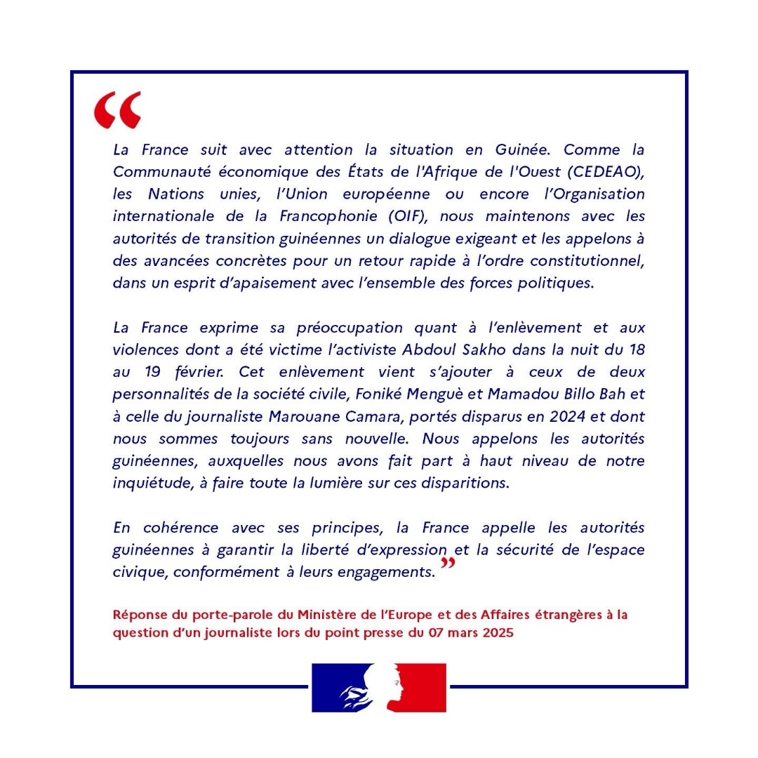 Dans une déclaration publiée par l’ambassade de France en Guinée, le gouvernement français exprime son inquiétude face aux enlèvements et aux violences subis par des personnalités de la société civile, dont l’activiste Abdoul Sakho, tout en réaffirmant son engagement en faveur du retour rapide à l’ordre constitutionnel et de la protection de la liberté d’expression en Guinée.