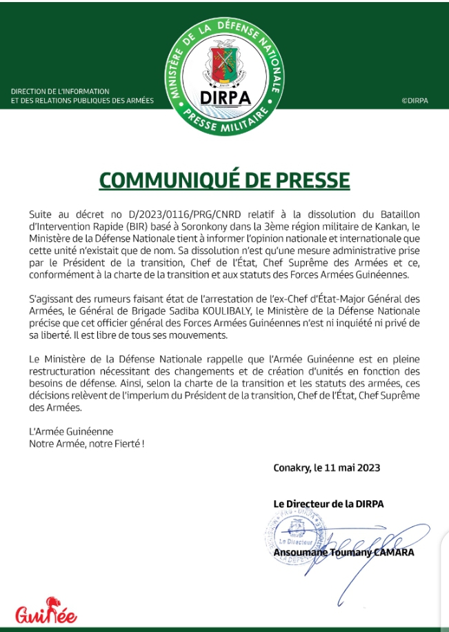 Il s’agit de la dissolution du bataillon d’intervention rapide (BIR) basé à Sorokony et les rumeurs sur l’arrestation du général de brigade Sadiba Koulibaly.