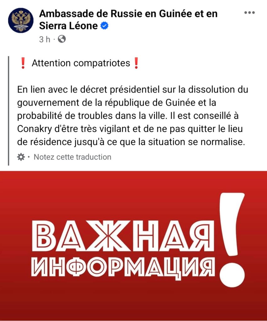 En lien avec le décret présidentiel sur la dissolution du gouvernement de la république de Guinée et la probabilité de troubles dans la ville. Il est conseillé à Conakry d’être très vigilant et de ne pas quitter le lieu de résidence jusqu’à ce que la situation se normalise.