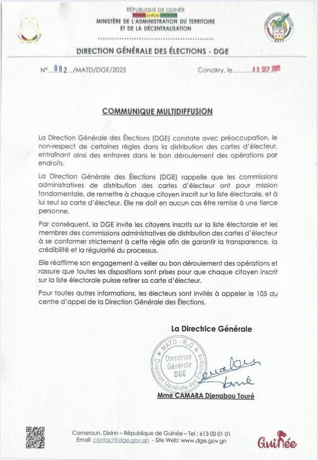 Distribution des cartes d’électeurs: la DGE constate avec préoccupation le non-respect de certaines règles (communiqué)