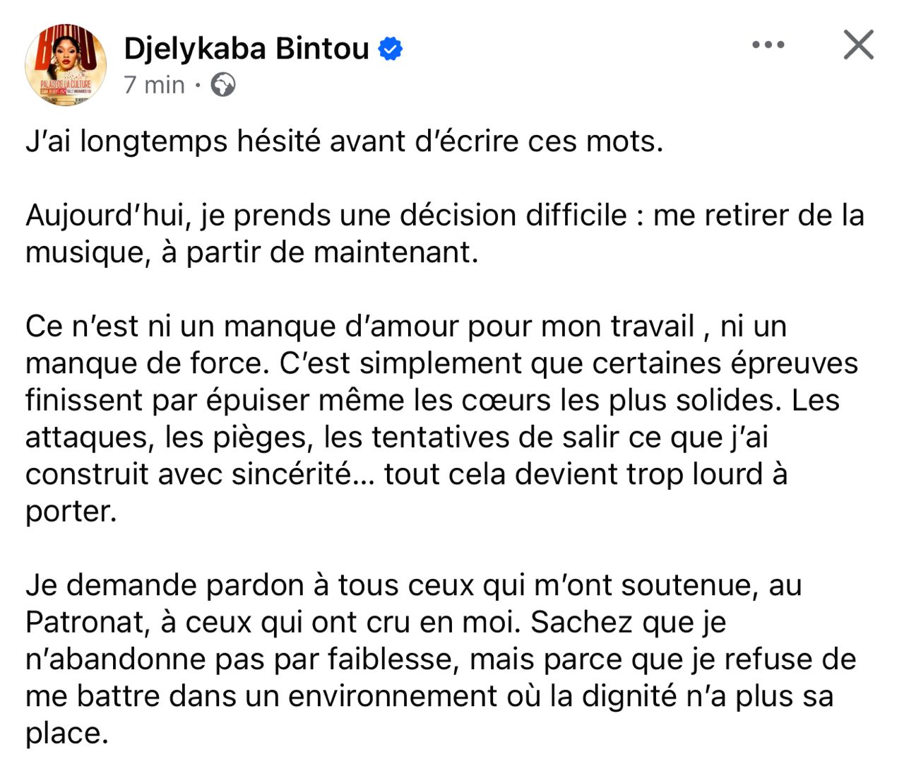 Dans un message poignant publié sur sa page Facebook, la chanteuse guinéenne Djelikaba Bintou a annoncé sa décision de se retirer de la scène musicale. Évoquant des attaques répétées, des tentatives de déstabilisation et un climat devenu pesant, l’artiste explique faire ce choix par souci de préserver sa dignité, tout en exprimant sa gratitude envers ses soutiens.